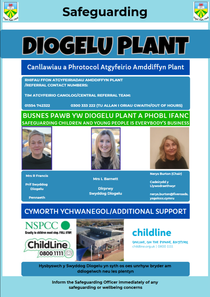 Cadeirydd y Llywodraethwyr/Chair of Governors: Nerys Burton (nerys.burton@fiveroads.ysgolccc.cymru)